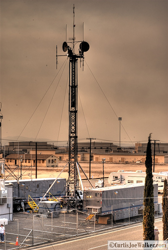 Because of the reconstruction activity, many areas and most buildings in the majority of the old base are dark and have no Electrical utility service. Much of the electrical utility infrastructure that is left is derelict and will be torn out and rebuilt. There is essentially no modern subscriber telecom infrastructure in the area of SCLA that was used for DUC07, meaning that existing copper facilities were suspect or no longer terminated. Local electrical utilities were unwilling to do a substantial electrical service installation that would only be used for a short (90 day) operational period, and most existing utility poles were in poor condition and unable to support the weight of transformers that would be required for the power service to support the C3 compound as well as the spectator area. Fortunately, there were two old barracks buildings in reasonable proximity to the C3 compound which still had electrical service of significant capacity. That challenge would be to tap the building service to provide 800 amps of 120/208Y, and construct temporary support infrastructure for cabling to deliver that power to the compound. The support structures would need to withstand the late summer and early fall desert winds characteristic of the area, and allow installation of additional cabling in support of the television production of the event. Also fortunately, Verizon had recently installed fiber capacity to the old base central office. No physical facilities existed to get service to the C3 Compound location, but connectivity could be provided with microwave equipment between the two locations.