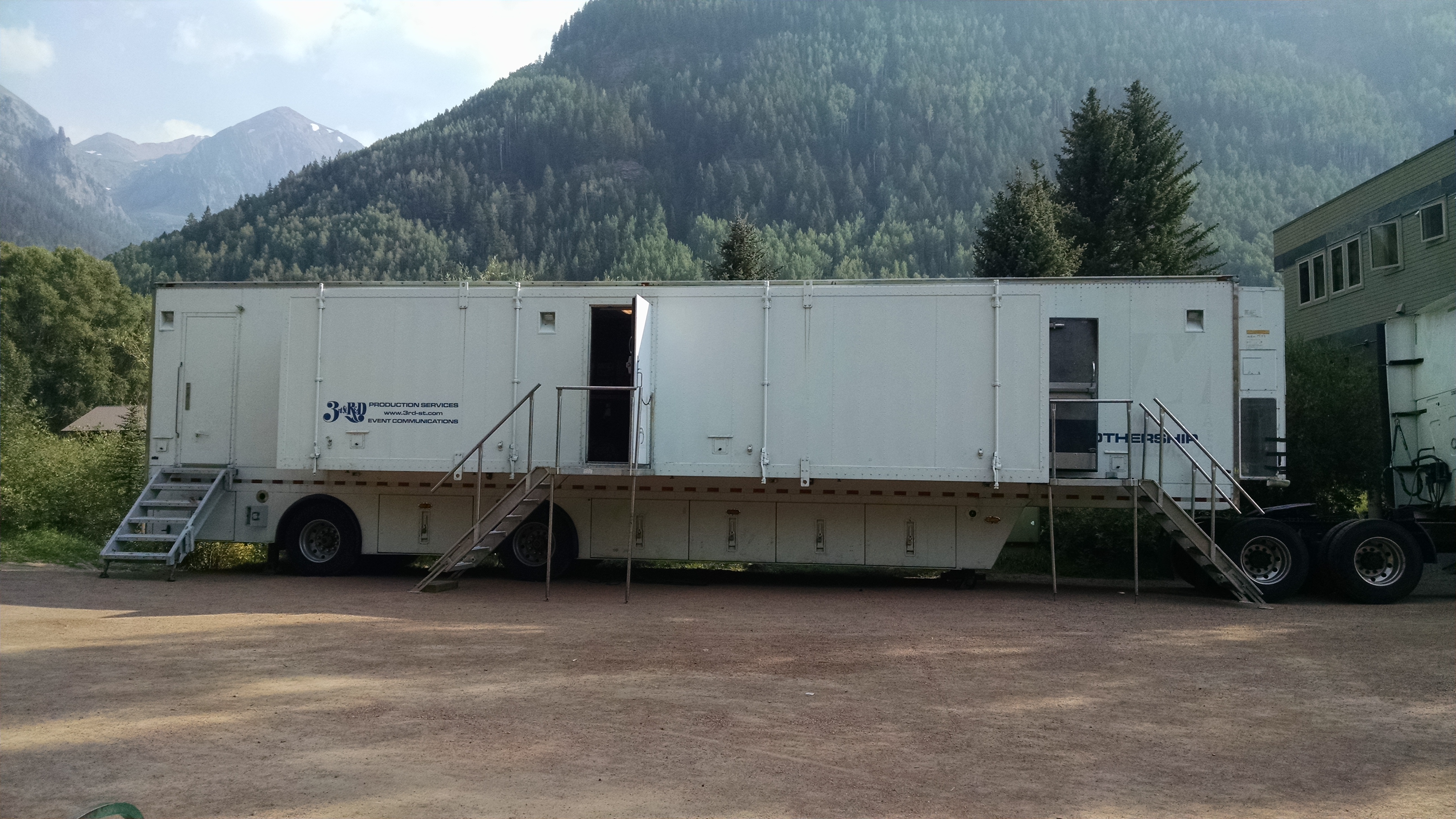 Comm Trailer that has succumbed to road salt and age. Originally an SD Television Production trailer built by Gerling, Mothership is now our mobile communications and operations facility. It features a 200amp 3-Phase or Single Phase power entrance and distribution system, and two HVAC units totaling 10 tons of capacity. The HVAC units are arranged as 5 tons for cooling equipment racks, and 5 tons for people. During August in Missouri (100+ and 70% humidity) one 5 ton unit can keep it uncomfortably cold. The "basement" has 384 sq ft of storage bins under the primary 384 sq ft of operations space. The expanding section is 32 ft long and adds 128 sq ft of operations space. The multi-tap power distribution system can accommodate any source voltage from 190 to 240 volts and transform it to 240/120V for use by the trailer and systems. Separate transformers for HVAC, as well as for technical power, isolate the mechanical systems from the technical systems. The technical power system incorporates 50KVA of precision voltage regulators. A 480V power source can be accommodated with an external 50KVA step-down transformer. All electronic systems and interior lighting operate on 12 or 24 volt DC prime power and are backed up with onboard battery banks, which provide several hours of operation in the absence of utility or generator power. The interior lighting was converted from 12 volt 50W Halogen lamps to 12V LED lamps which conserves significant power draw, dropping from 1KW down to 127W. The entire roof surface is non-skid and load bearing. "Cheeseboro" clamping fixtures provide for rigging and assembly of 1.5" pipe structures to accommodate microwave dishes and antenna mountings at the rear of the expanding section. The trailer is intended to be a companion unit for our high-capacity mobile tower, along with a repeater shelter; as the hub of a large system. In combination with our 250KW generator trailer and our warehouse/shop trailer, these units constitute a mobile compound for a sustained deployment or project. (Hit "back" after viewing these links)