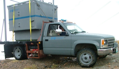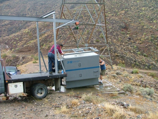 systems, as microwave repeat stations, or any combination thereof. Multiple site systems can operate in Star, Ring, or linear line microwave topologies with four or eight T1's passing through. With the addition of Wireless LAN equipment, they can function as wireless access points as well. One contains six 100W Motorola MTR2000 UHF repeaters, another contains three MTR2000's arranged as a wide-area VHF/UHF/800 Interoperability system, and the last two are receive sites for a multi-site voting system. All contain T1 channel banks, microwave equipment, and routers; as well as critical parameter site remote monitoring equipment. Maximum microwave hop distance between sites is 42 miles with favorable topology. Each shelter has an integral 60A power distribution with 100' of feeder cable. They can provide up to 30A to external equipment or devices. They can be loaded onto a specialized truck, driven to a remote location, and unloaded. In the absence of utility power, they will operate on 24V DC prime power without air conditioning if the ambient temperature conditions permit. With air conditioning, they can operate from a 5000 watt generator and provide DC backup for the electronic systems. Back to Large Systems, or 2004 Darpa Page, 2005 Darpa Page, 2007 Darpa Page. |